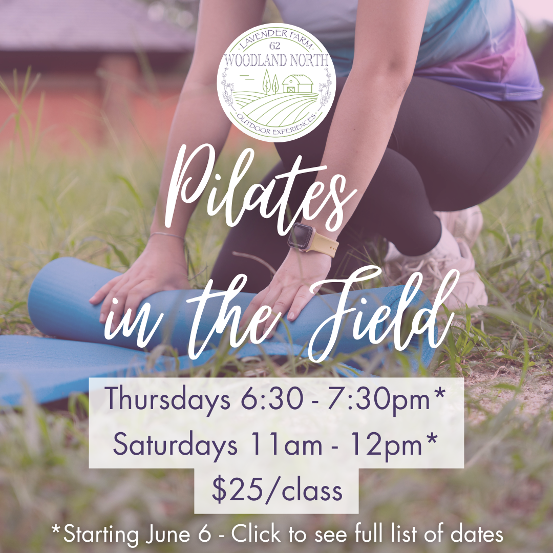 Join instructor Kirsten for pilates in the lavender field Thursdays- 6:30-7:30 pm & Saturdays 11-12*. Class includes a lavender citrus rose water beverage and lavender oat bread snack.